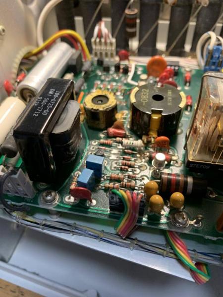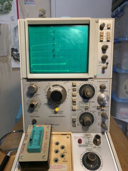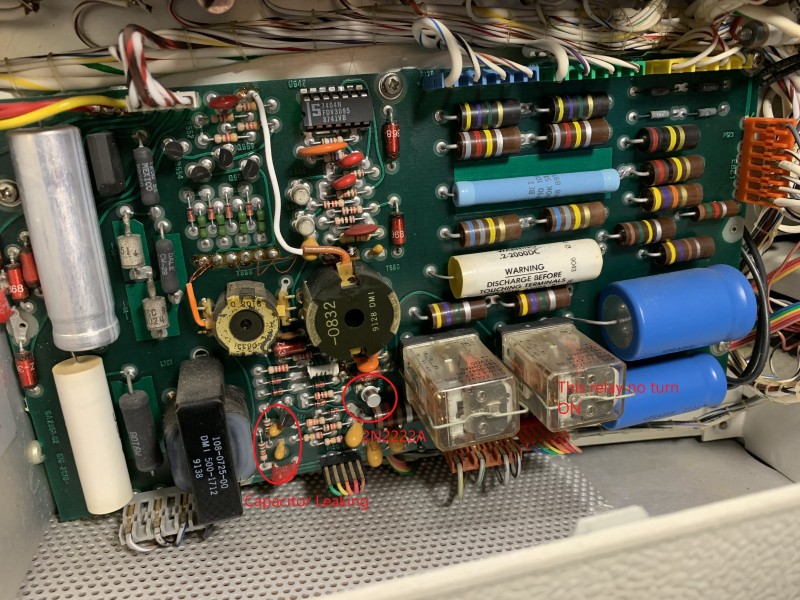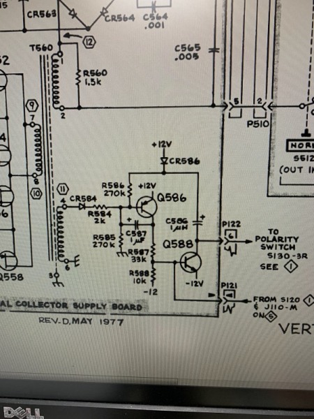 The Tek 577 curve tracer is more than 25 years and components start to fail from time to time.  The symptom is front YELLOW light ON (Collector Supply Disable Light)  after power on and cannot output any voltage.  After tracing, the circuit, the reasons is due to K115 not turn on, due to K125 not turn on, due to Q588 open.  Replace new 2N222A to Q588 but always burnt (try 3 pcs) after power up!  Later check base voltage is at 6.xV dc which is too high relative to Emitter at -12V.  Thus transistor will be burnt after power up.  Check Q586 is fine and then after removing Q586, the base at Q588 is still very high voltage.  Thus suspect C587 defective (leaking).  So change C587 by using 0.68 + 0.47 = 1.15uF (original is 1uF) from Tant to film capacitor.  Also change C586 as it may also be defect soon.  After plug in Q586 and Q588, the set works again!  Here are the pictures of repair.